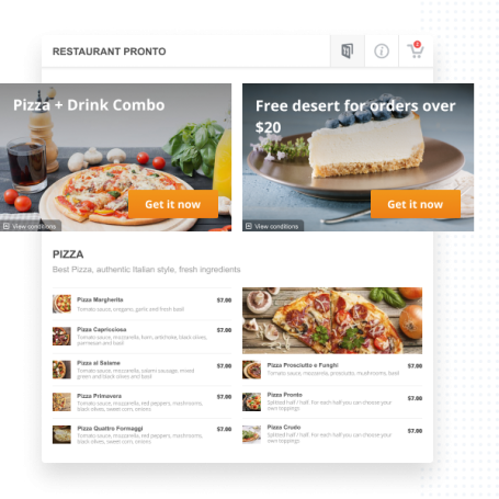 With our promotional marketing software, encourage first time online and on-premise orders with a couple of hard to-say-no-to promos located at the very top of your menu.
